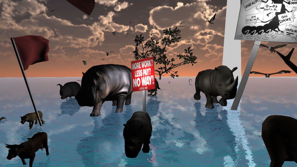i played 5 minutes of it a couple of years ago and thought it was kinda wank since I’d played a bunch of meta stuff recently about complaining about making games. giving it a fairer shake though, a bunch of dogs being told to make a game by a billionaire and then unionising and striking when they don’t get their fair dues is actually quite funny. and its inbetedness to and reference of 19th/20th century absurdist theatre in Ubu Roi is fun and they’ve got link from zelda in there and a bunch of animals and stuff.